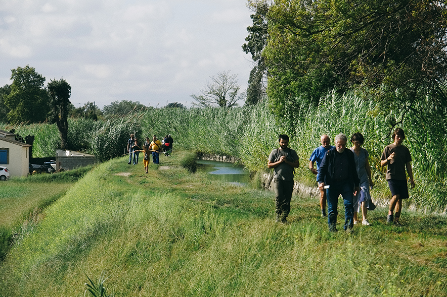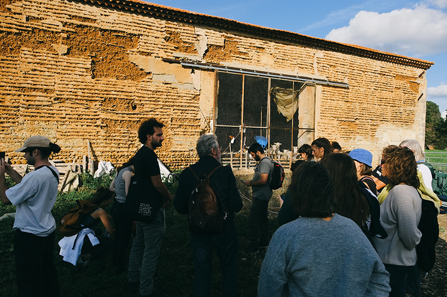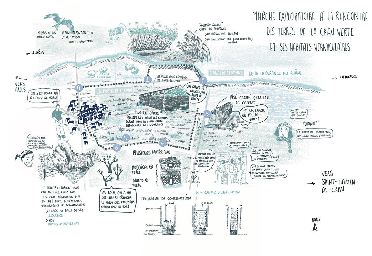 Au départ de Moulès, l’atelier MARE a invité en 2022, habitant.e.s, professionnel.le.s du bâtiment et autres curieux.ses à parcourir la Crau verte, à la découverte de ses architectures vernaculaires délaissées et de ses paysages agricoles singuliers. Hubert Guillaud, membre de CraTerre, nous a retrouvé pour une conversation, ainsi, collectivement, nous avons échangé sur ce qui fait l’existence du territoire de la Crau, la nature de ses sols, riches en sable et galets roulés par l’ancien delta de la Durance, l’agriculture, la culture du foin et ses canaux d’irrigation, leurs berges pleines de cannes de Provence, l’élevage de moutons et de chèvres.
